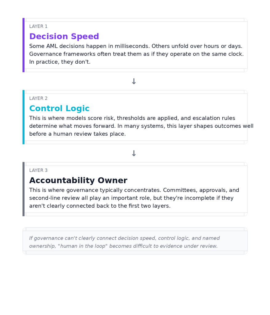 The takeaway: If governance can’t clearly connect decision speed, control logic, and named ownership, “human in the loop” becomes difficult to evidence under review.