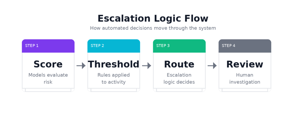 Models score activity, but thresholds and routing logic determine what gets attention, what gets delayed, and what never enters review. Those choices determine how compliance effort is deployed across the system.